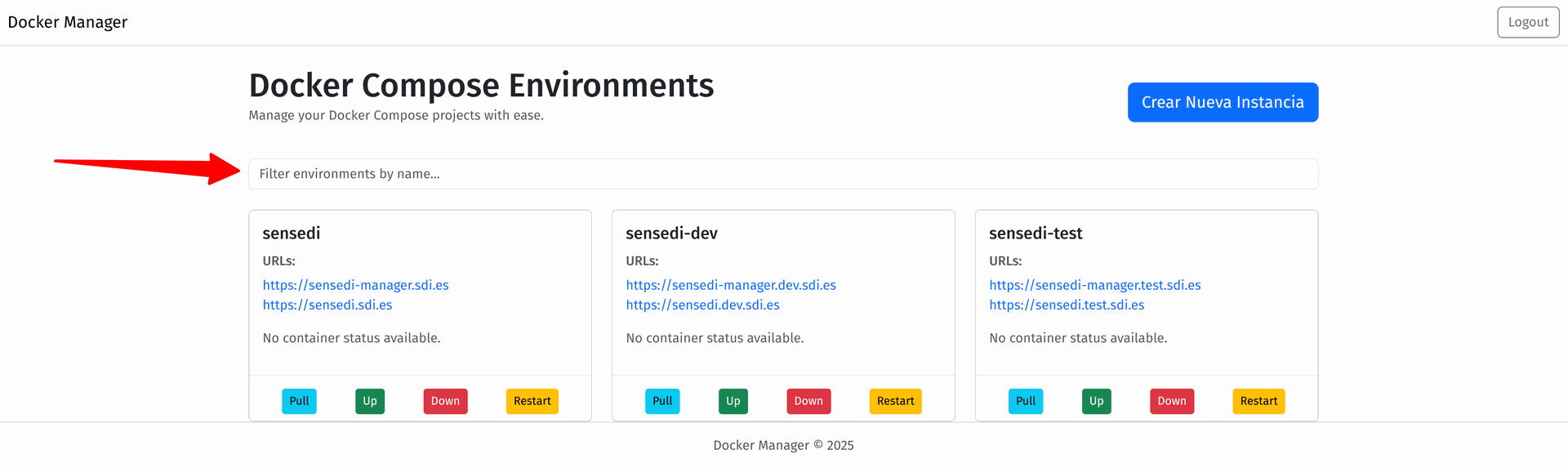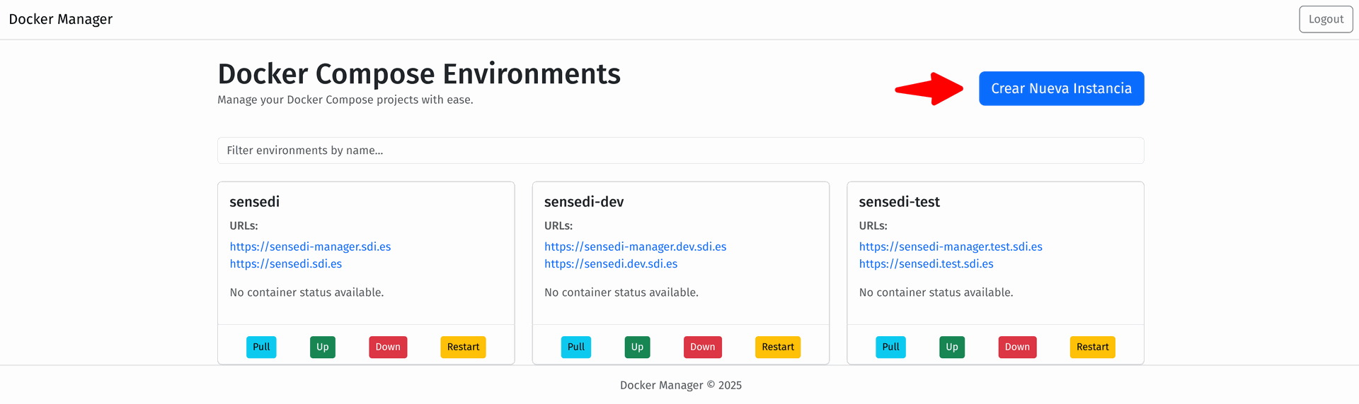 El Gestor de Instancias de Docker Compose es una herramienta orientada a la administración y supervisión centralizada de múltiples entornos Docker Compose en servidores dedicados. Ofrece una interfaz gráfica donde las instancias se presentan como tarjetas individuales, mostrando el nombre, URLs principales, y botones de acciones rápidas.