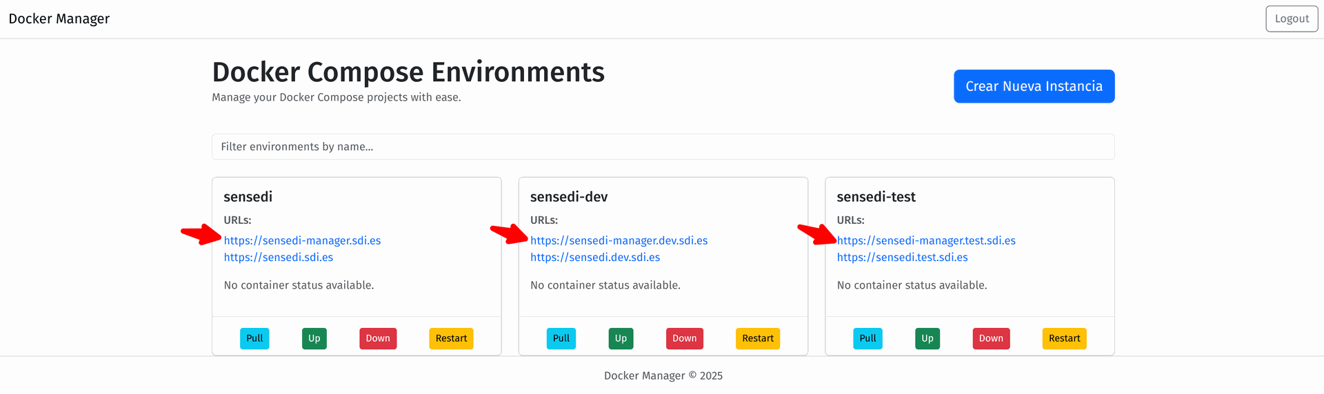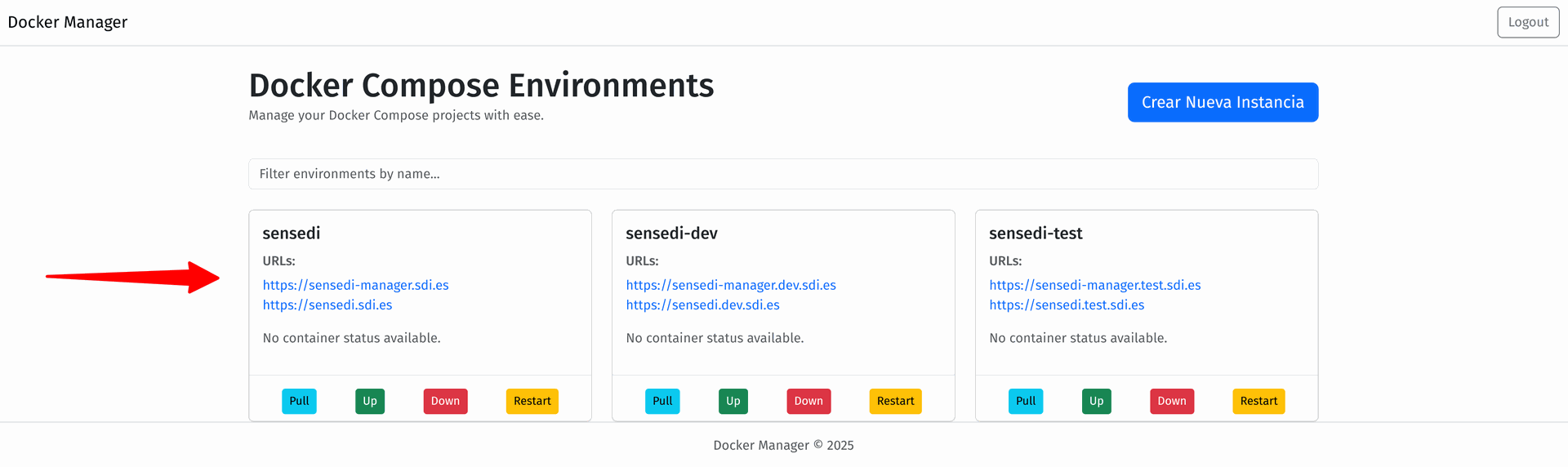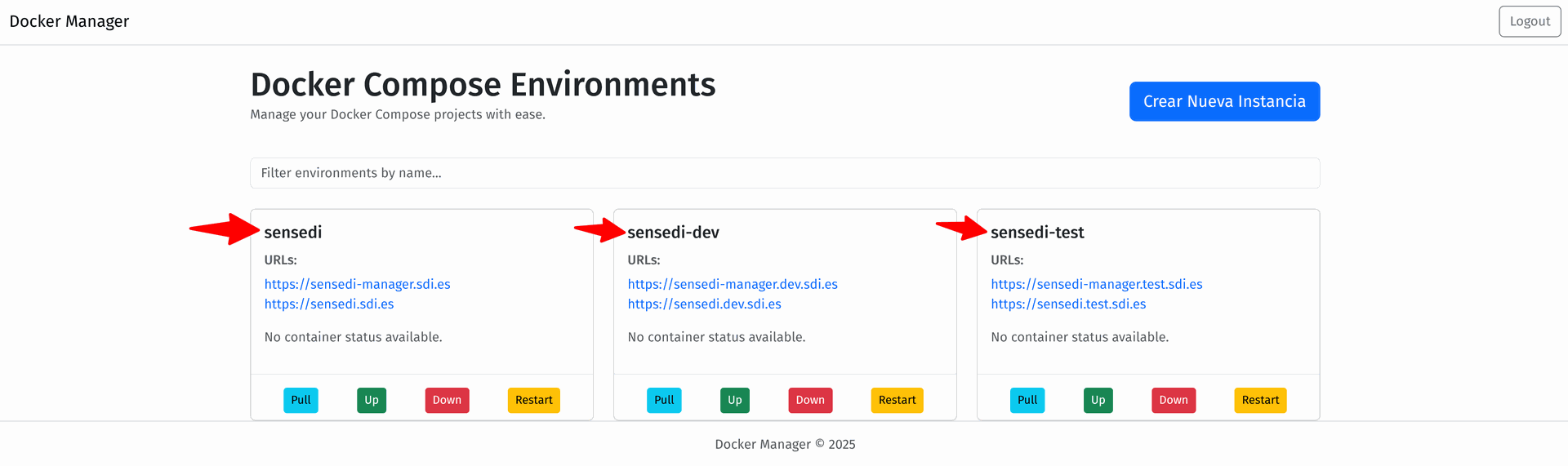 Cada tarjeta muestra el nombre asociado a la instancia de Docker Compose correspondiente.