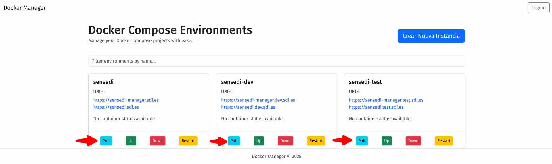 - Visualización del estado de los contenedores de cada instancia (actualmente no funcional).