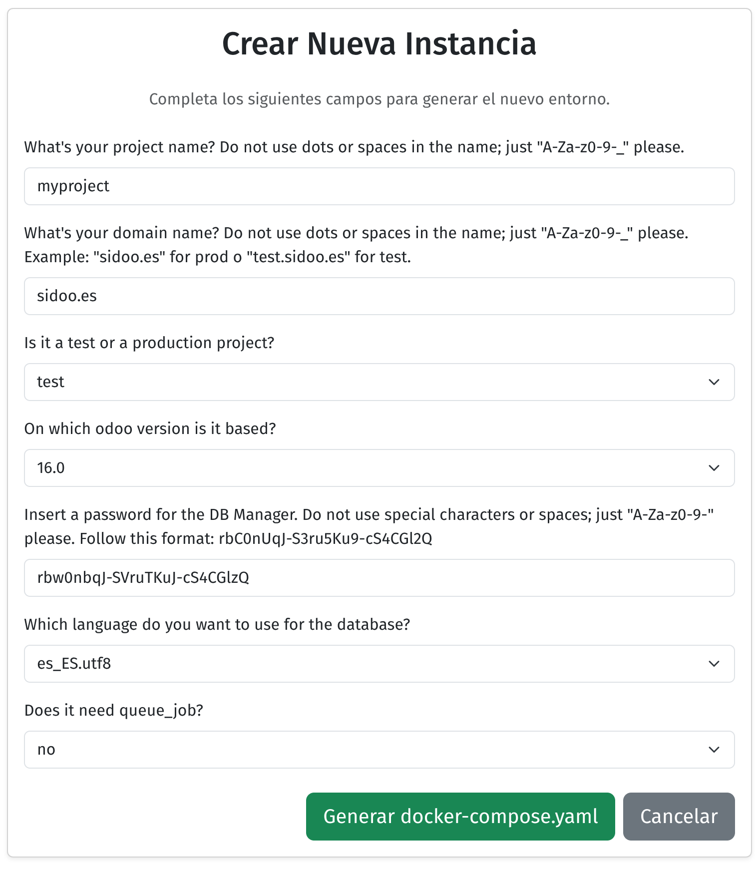- Creación de nuevas instancias a través de un formulario que solicita: nombre, URL, tipo (test/producción/pruebas), versión (de la 13 a la 18), contraseña, idioma de la base de datos y activación de queue job.